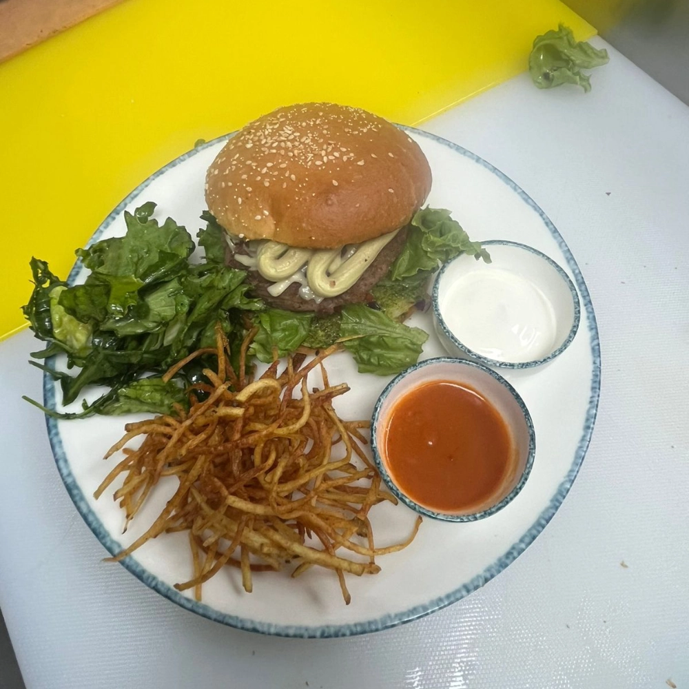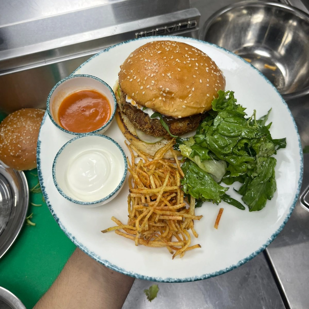 Rajma Patty, Crudo, Lettuce, Chimichurri, Avocado Puree, Emmental Cheese, Potato Salli, House Salad, Dip – Garlic Toum + Hot Sauce.