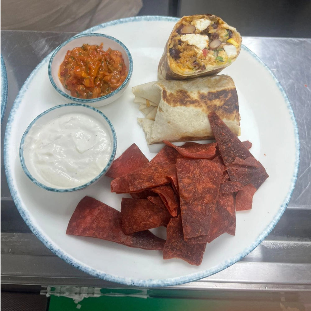 ortilla, Yellow Cheddar & Mozzarella, Saute Bell Pepper, Paprika Yellow Rice, Rajma Mix, Chicken Shawarma / Paneer, Garlic Toum, Charred Corn Salsa, Avocado Slices, Pico de Gallo + Garlic Toum.