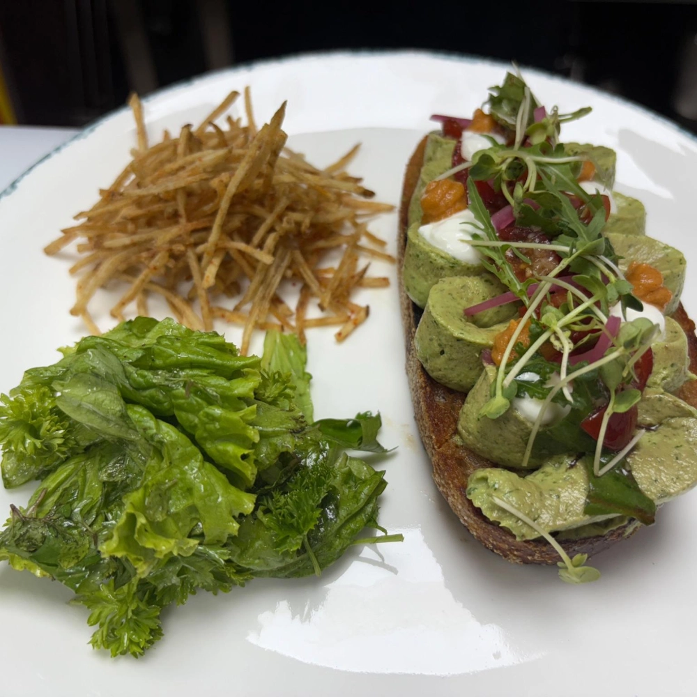 Sourdough, Avocado Puree, Balsamic Cherry Tomato, Whipped Feta, Spicy Apple Chutney, Pickle Onion, Microgreens, Arugula, Potato Salli, Side Salad.