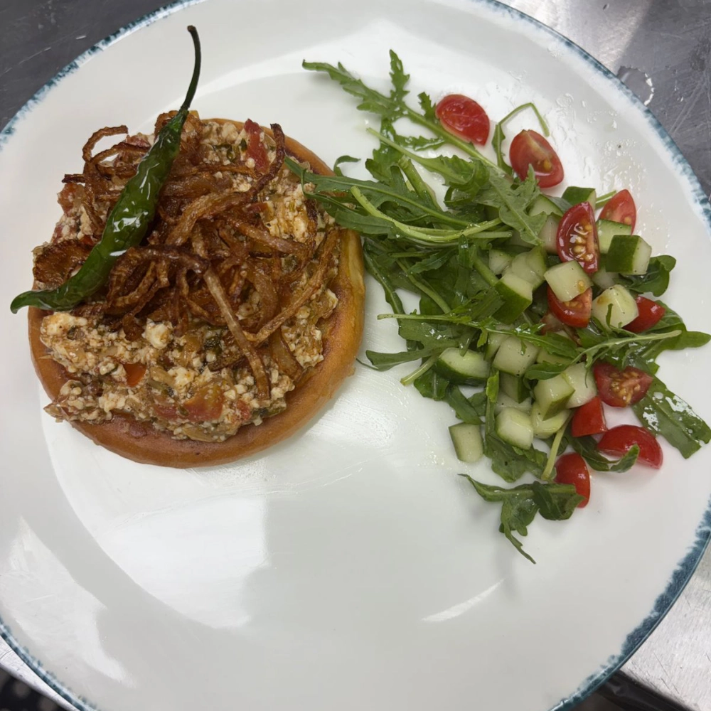 Scrambled Eggs or Tofu, Akuri Mixture, Burger Bun, Barista Onion, Summer Salad with Arugula, Fried Chilli.