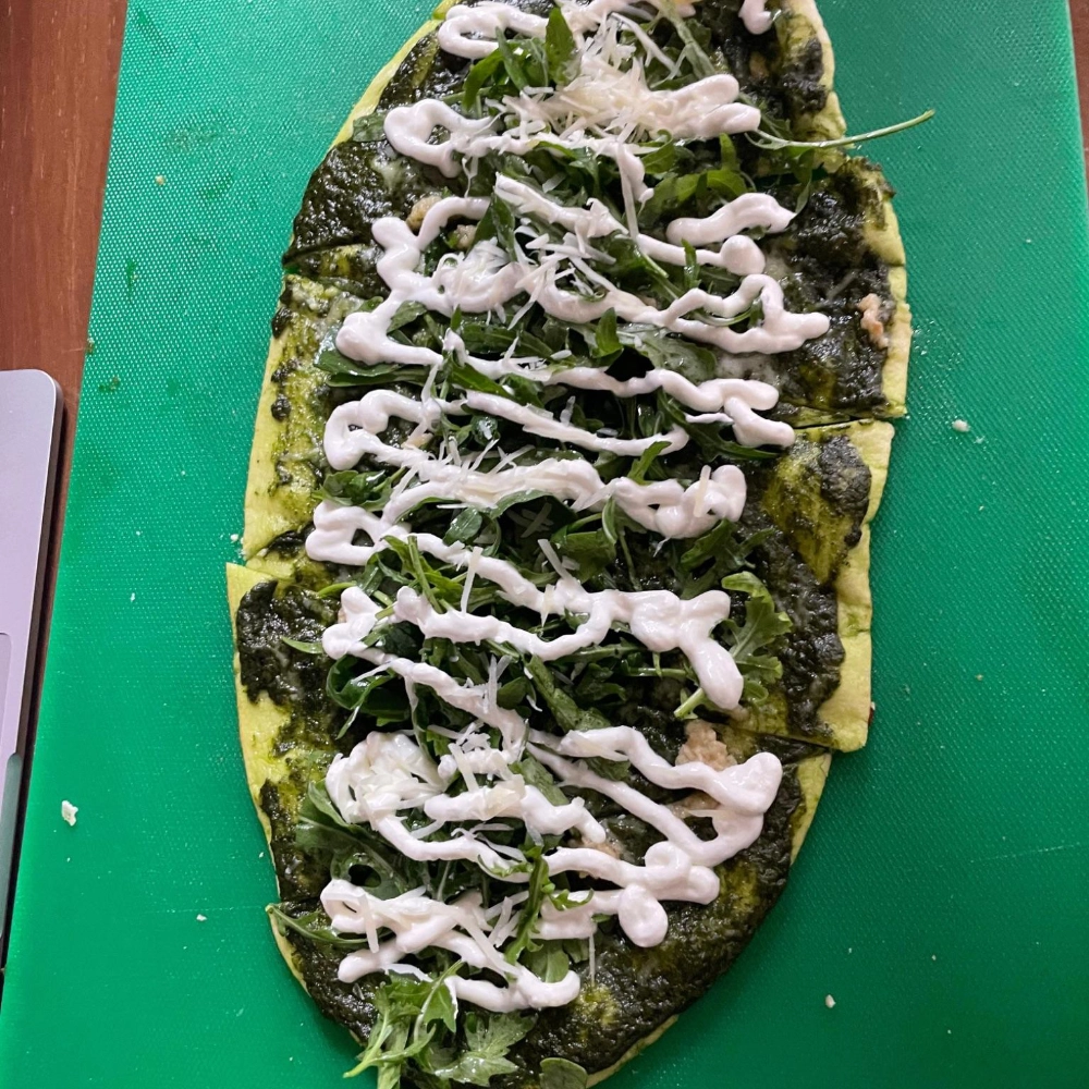 Flatbread Base, Pesto Sauce (diluted), Garlic Confit Puree, Garlic Oil, Arugula + Black Pepper Dressing, Parmesan.