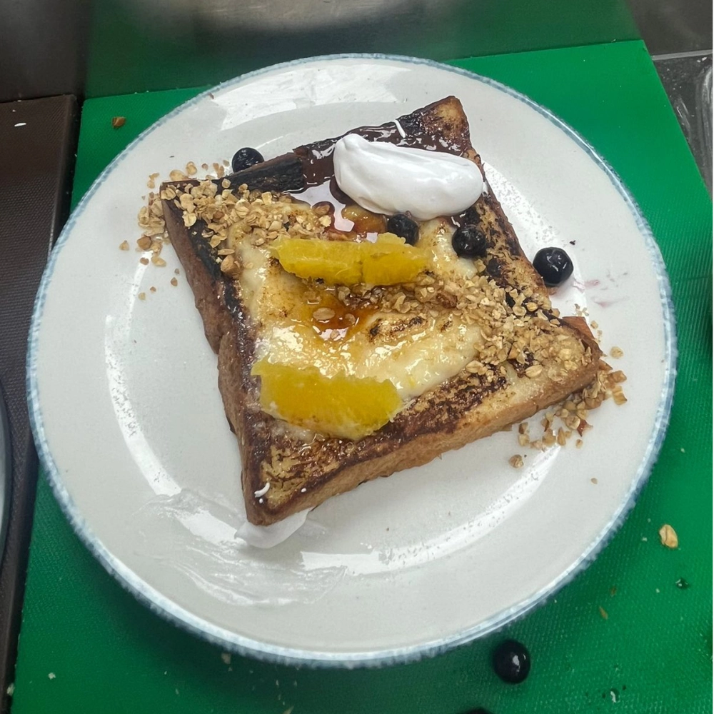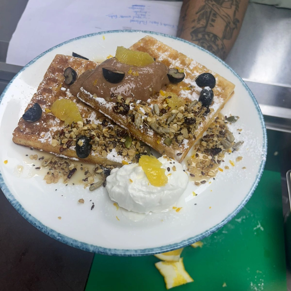 Waffle, Chocolate Mousse, Whipping Cream, Maple Syrup, Icing Sugar, Granola, Berry, Orange Supreme.