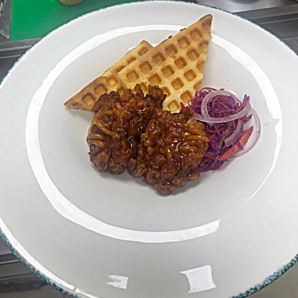 Fried Chicken Thigh – Sliced, Waffle, Chilli Maple Butter, Red Cabbage Slaw + Pickle Onion.