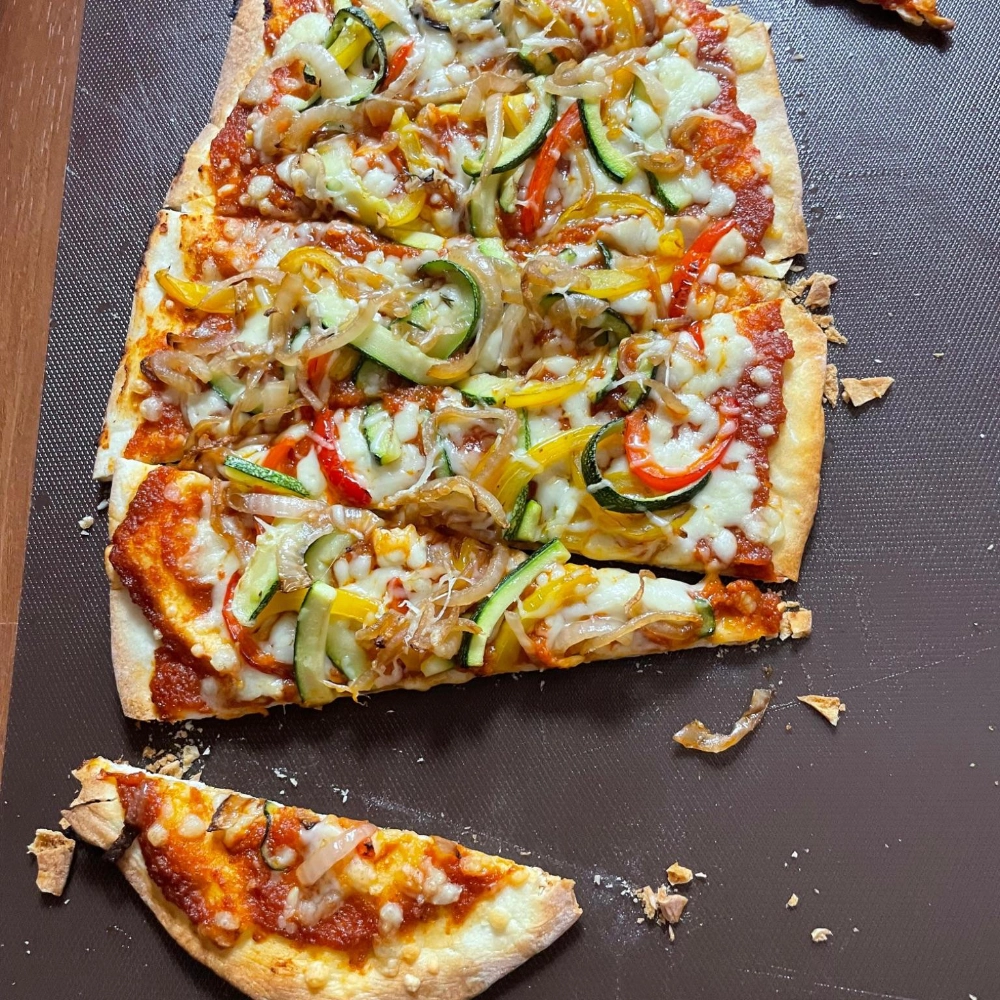 Flatbread Base, Tomato Sauce, Mozzarella (2 dip bowl), Roasted Zucchini, Onion, Duo Bell Peppers, Garlic Oil, Basil.