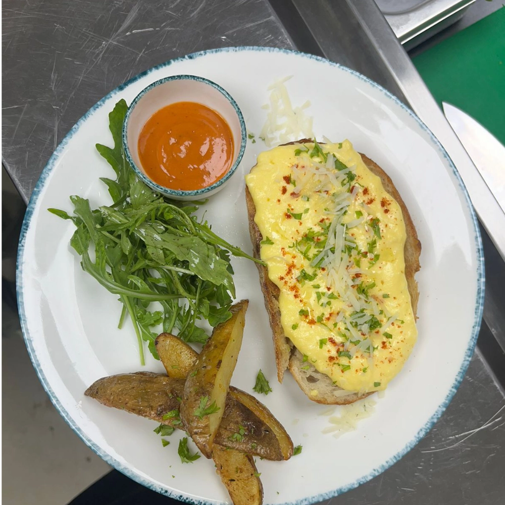 Eggs + Cream Cheese + Butter, Truffle Oil, Parmesan Snow, Bread Choice – Sourdough / Milk Bread, Rosemary Potatoes, Arugula, Hot Sauce, Black Pepper Dressing.