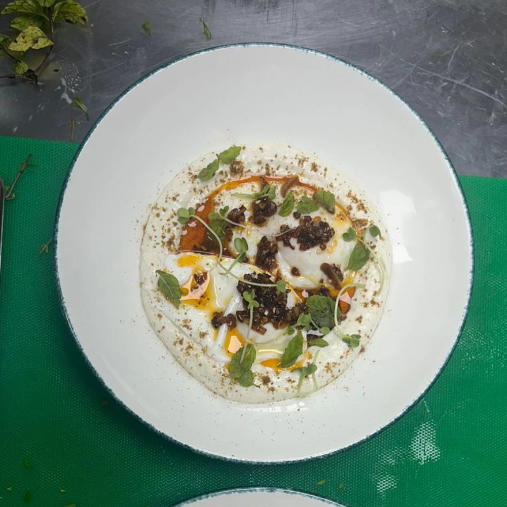 Poached Eggs 2pc, Garlic Yogurt + Za’atar Curd, Chilli Crisp + Chili Oil, Mint, Cumin Powder, Pita Bread / Sourdough, Greens.