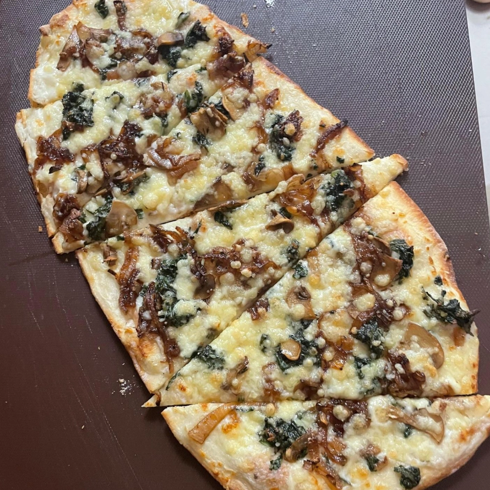 Flatbread Base, Bechamel, Salt, Parmesan, Spinach + Garlic Puree, Caramelised Onion, Saute Thyme Mushroom, Truffle Oil.