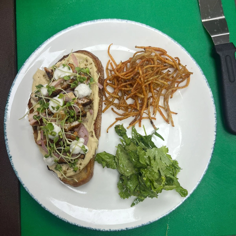 Sourdough, Shawarma Chicken Sliced, Hummus, Pickle Onion, Toum, Microgreens, Potato Salli, Side Salad.