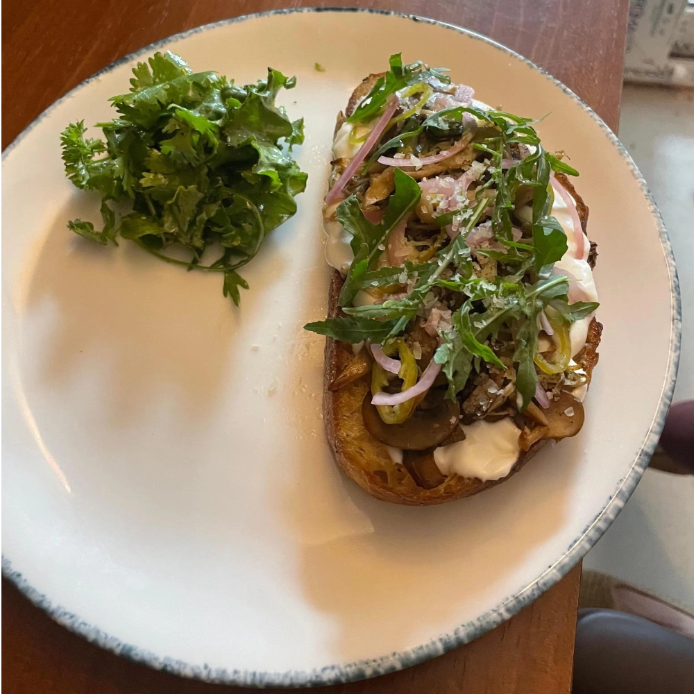 Sourdough, Sautéed Mushroom Mix, Whipped Goat Cheese, Truffle Oil, Pickled Onions, Parmesan Snow, Pickle Bhaji Mirch, Arugula, Potato Salli, Side Salad.